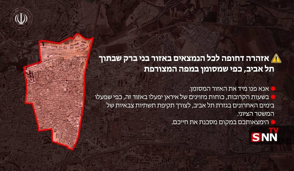 طی ساعات آینده نیروهای مسلح ایران در این ناحیه همچنان که طی روزهای اخیر در محدوده تل اویو عمل نموده است، برای حمله به زیرساختهای نظامی رژیم صهیونیستی وارد عمل خواهد شد. وجود شما در این ناحیه جانتان را به خطر میاندازد.