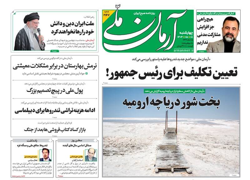 به گزارش سلام نو، هستهای و حقوق بشر بهانه است دشمن با دین و دانش ایران مخالف است، آقا ایستاده ایران ایستاده، سر خم می سلامت، علمدار دین و دانش، دست پر ایران و…از جمله تیترهای روزنامههای چهارشنبه ۸ مرداد هستند.