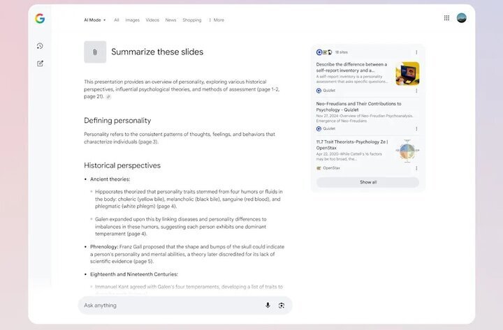 این شرکت در هفته آینده نیز پشتیبانی از آپلود پی دی اف در نسخه دسک تاپ را فراهم می کند. این قابلیت به افراد در درک بهتر مطالب طولانی مربوط به دورههای آموزشی یا کاری کمک می کند. کاربر میتواند از حالت هوش مصنوعی بخواهد اسناد مذکور را برایش خلاصه کند و سپس سؤالات تکمیلی بپرسد. AI Mode پاسخهای خود را با ارجاع به مطالب بارگذاریشده توسط کاربر و همچنین اطلاعات موجود در وب ارائه خواهد داد.