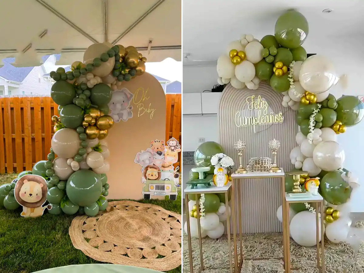 یکی دیگر از روش‌های پرطرفدار در بادکنک آرایی تم سبز، استفاده از آرک‌ها و ستون‌های بادکنکی است. این شکل‌ها می‌توانند در ورودی سالن، پشت میز تولد یا محل اجرای مراسم قرار بگیرند و به فضای جشن هویت ببخشند. طراحی آرک‌های بادکنکی با رنگ‌های مختلف سبز و ترکیب آن‌ها با برگ‌های مصنوعی، حس ورود به یک باغ بهاری را ایجاد می‌کند که برای مهمانان بسیار خاطره‌انگیز خواهد بود. علاوه بر این، بادکنک‌های حبابی و شفاف با رنگ سبز داخل آن‌ها، حالتی مدرن و شیک به دکوراسیون می‌دهند.