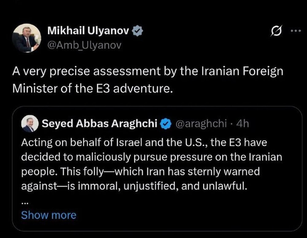 به گزارش سلام نو، نماینده روسیه در سازمان‌های بین‌المللی در توئیتی به پیام توئیتری اخیر سید عباس عراقچی وزیر امور خارجه کشورمان واکنش نشان داد.
