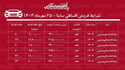 به گزارش سرویس خودرو اقتصادآنلاین، براساس آگهی های منتشر شده از فروش اقساطی ساینا در نمایشگاه های شخصی خودرو، ساینا S دندهای بنزینی مدل ۱۴۰۴ با پیشپرداخت ۳۲۰ میلیون تومان و اقساط ماهیانه ۹ میلیون تومان در ۶۰ قسط عرضه میشود؛ طرحی که برای خریداران با بودجه محدود اما توان بازپرداخت بلندمدت مناسب است.
