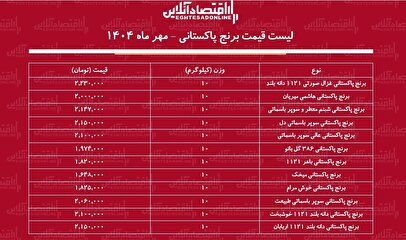 «برنج پاکستانی هاشمی میریان» به ازای هر ۱۰ کیلوگرم با قیمت ۲,۰۰۰,۰۰۰ تومان عرضه میشود. همچنین، «برنج پاکستانی سوپر باسماتی طبیعت» در کیسه ۱۰ کیلویی با قیمت ۲,۰۶۰,۰۰۰ تومان به فروش میرسد.